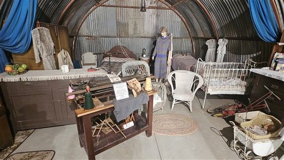 A corrugated iron hut displaying the ‘make do’ housing used by some of the 250 ex-servicemen in our region who were granted horticultural properties as part of the government’s repatriation scheme after WWII. The Village Nissen Hut has been furnished to show the living conditions of the early ‘blockies’ and their families. Initially, huts like this did not have domestic water or electricity. Water had to be carted in tanks on block trolleys pulled by horse or tractor.